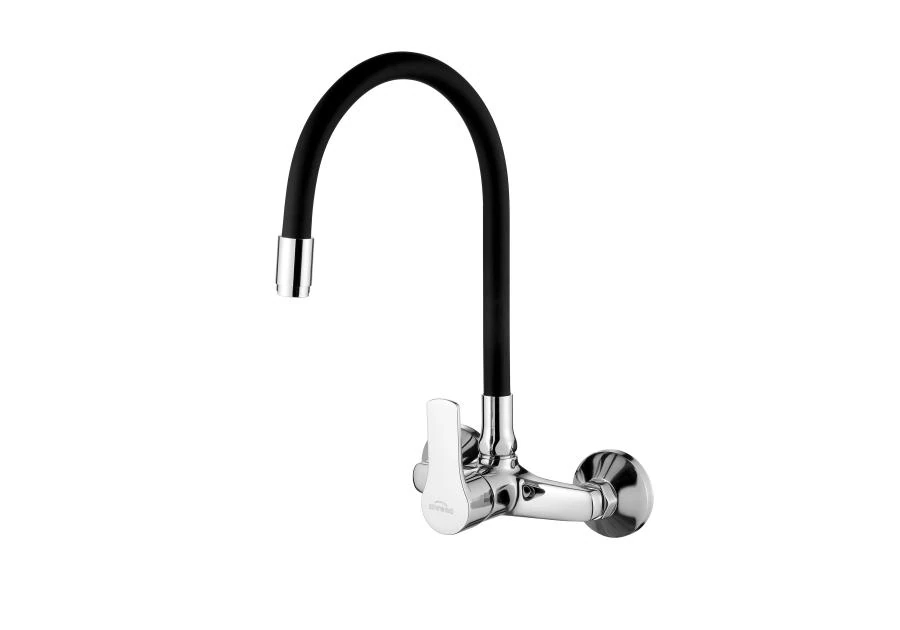 Bateria ścienna z elastyczną wylewką w kolorze chrom/czarny. Wygoda użytkowania i oszczędność wody.