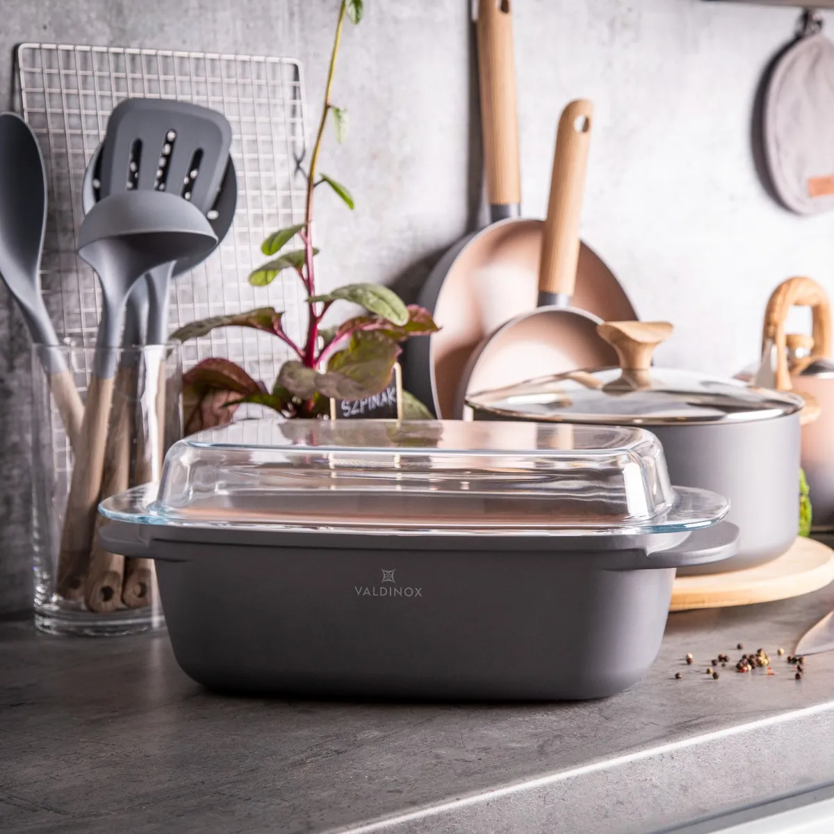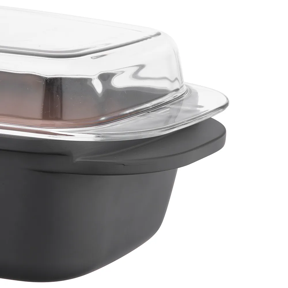 Wyjątkowym elementem zestawu jest żaroodporna, szklana pokrywa o pojemności 2,4 l, którą można wykorzystać również jako osobne naczynie do zapiekania lub serwowania potraw. Elegancki design z subtelną cieniowaną powłoką sprawia, że brytfanna prezentuje się stylowo w każdej kuchni.