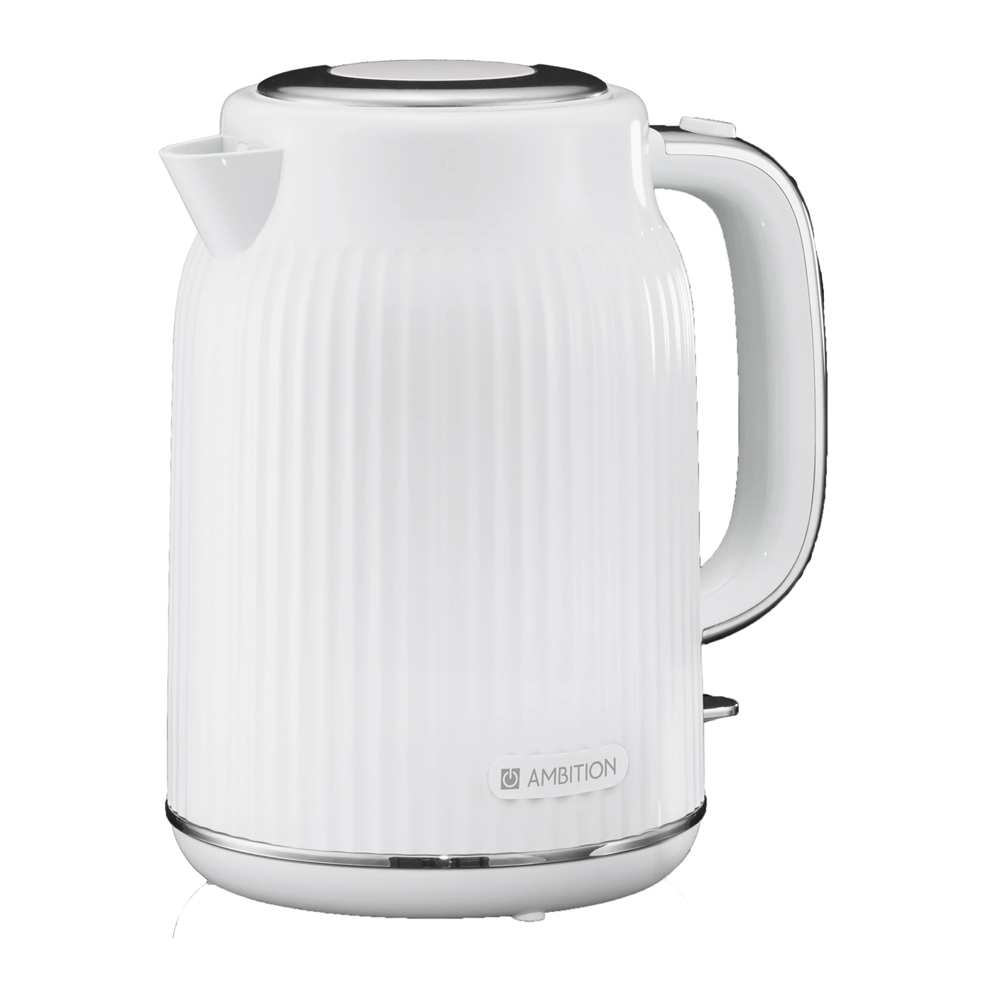 Czajnik elektryczny z kolekcji Vintage marki Ambition Electro to połączenie klasycznej elegancji z nowoczesną technologią. Wykonany z wysokiej jakości stali nierdzewnej i tworzywa sztucznego, zachwyca subtelnym, matowym wykończeniem w kolorze białym oraz pionowym żłobieniem, które nadaje mu wyjątkowego, retro charakteru.