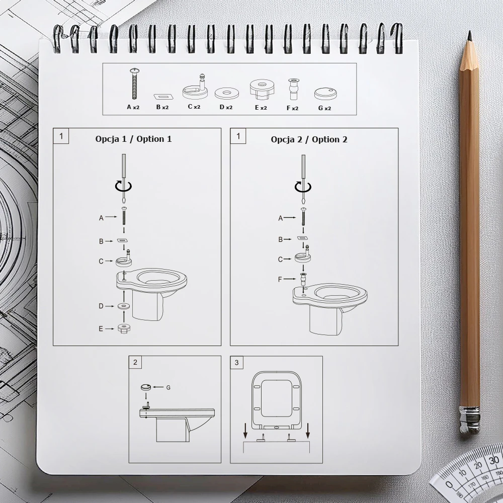 Deska WC Bogota oferuje dwa sposoby montażu – standardowy (od góry i od dołu) oraz z kołkami mocującymi tylko od góry. Dzięki regulowanej odległości zawiasów (7–18 cm) jest kompatybilna z większością dostępnych na rynku misek WC.