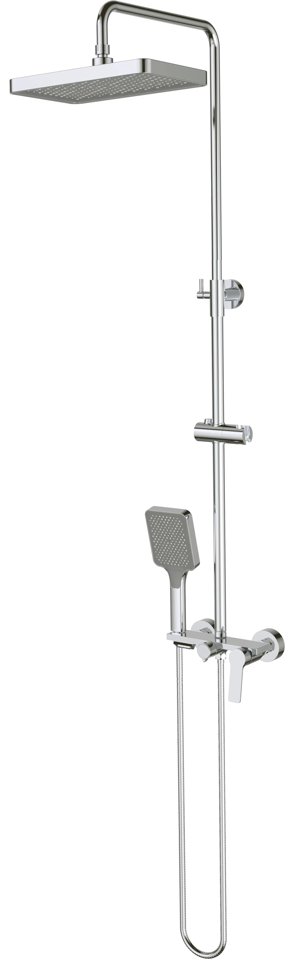 Zestaw wyposażony jest w regulowaną wysokość górnej deszczownicy, dzięki czemu można łatwo dopasować jej ustawienie do wzrostu użytkowników oraz wysokości kabiny prysznicowej. Duża, prostokątna głowica natryskowa zapewnia szeroki i równomierny strumień wody, który pozwala na komfortowy, relaksujący prysznic.