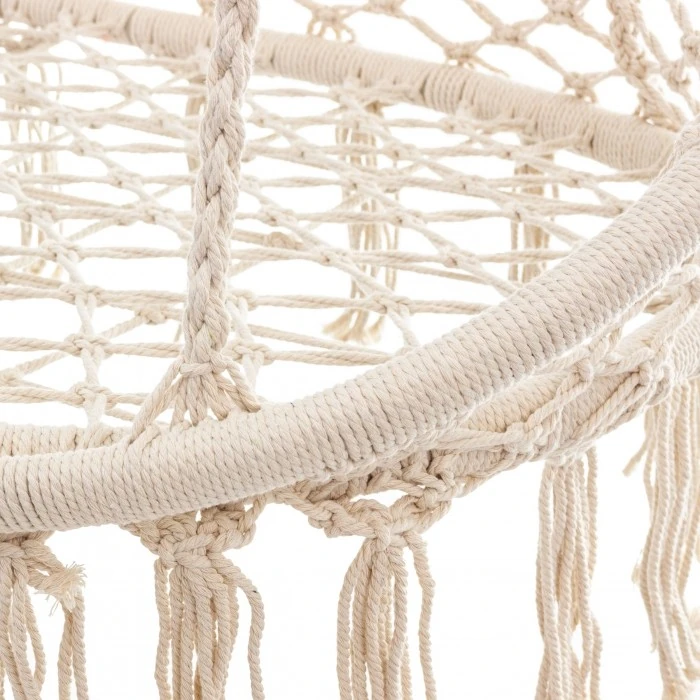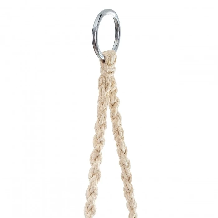 Wykonany z wytrzymałych bawełnianych lin fotel łączy trwałość z naturalnym wyglądem. Duża powierzchnia siedziska oraz wysokie oparcie umożliwiają relaks w dowolnej pozycji – zarówno siedzącej, jak i półleżącej. Stabilny system zawieszenia z czterema linami i metalowymi uchwytami gwarantuje bezpieczeństwo użytkowania.