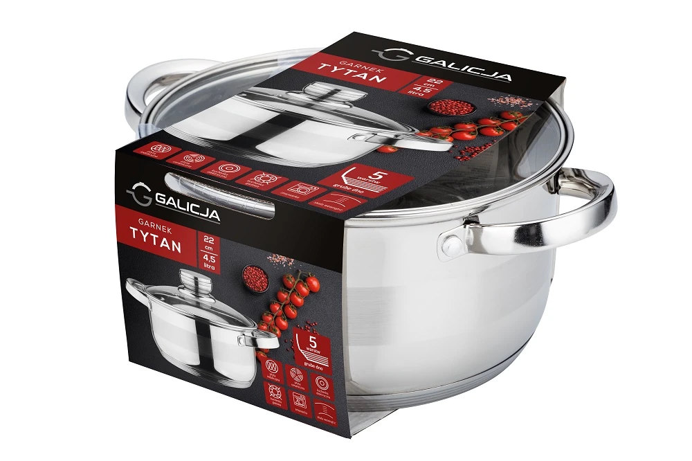 Garnek Tytan to solidne naczynie ze stali nierdzewnej, wyposażone w 5-warstwowe dno dla równomiernego rozprowadzania ciepła. Posiada szklaną pokrywkę z ergonomicznym uchwytem i wewnętrzną podziałkę. Przystosowany do wszystkich rodzajów kuchenek, łatwy w czyszczeniu i wyjątkowo trwały.