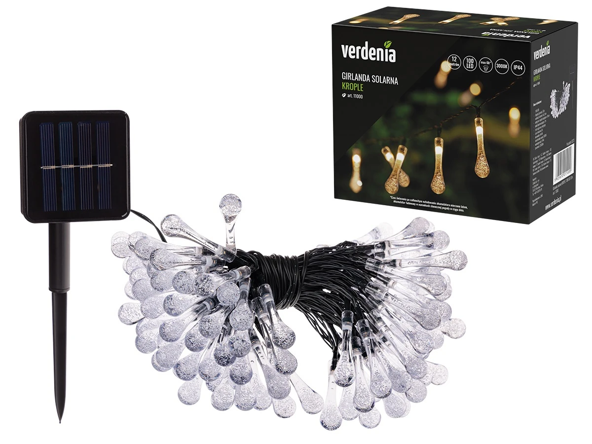 Girlanda solarna KROPLE 100 LED 12 m to dekoracyjne oświetlenie ogrodu, tarasu czy balkonu. Wykonana z trwałych materiałów, ładowana energią słoneczną. Oferuje 6 godzin świecenia w trybie ciągłym lub migającym, jest wodoodporna (IP44) i łatwa w montażu, idealna na świeżym powietrzu.
