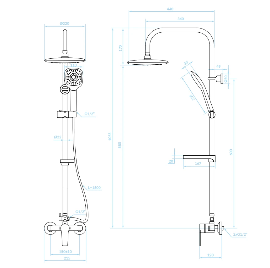 Kwadratowa deszczownia o wymiarach 220 x 220 mm oraz ergonomiczna słuchawka o rozmiarze 250 x 110 mm oferują relaksujący strumień deszczowy, który idealnie sprawdzi się podczas codziennego prysznica. Regulowany uchwyt słuchawki pozwala skierować wodę dokładnie tam, gdzie jest potrzebna – zwiększając komfort i funkcjonalność użytkowania.