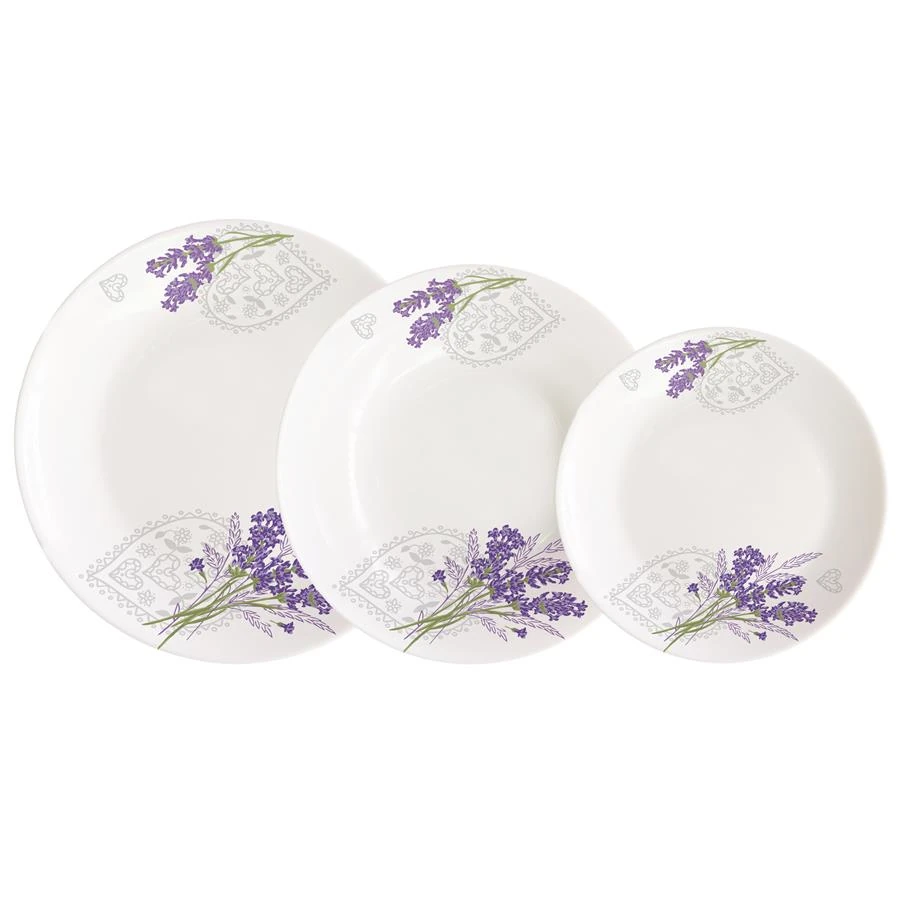 Komplet obiadowy Lavender 18-elementowy dla 6 osób ze szkła hartowanego. Elegancki motyw lawendy, odporny na uszkodzenia, do zmywarki i mikrofali.