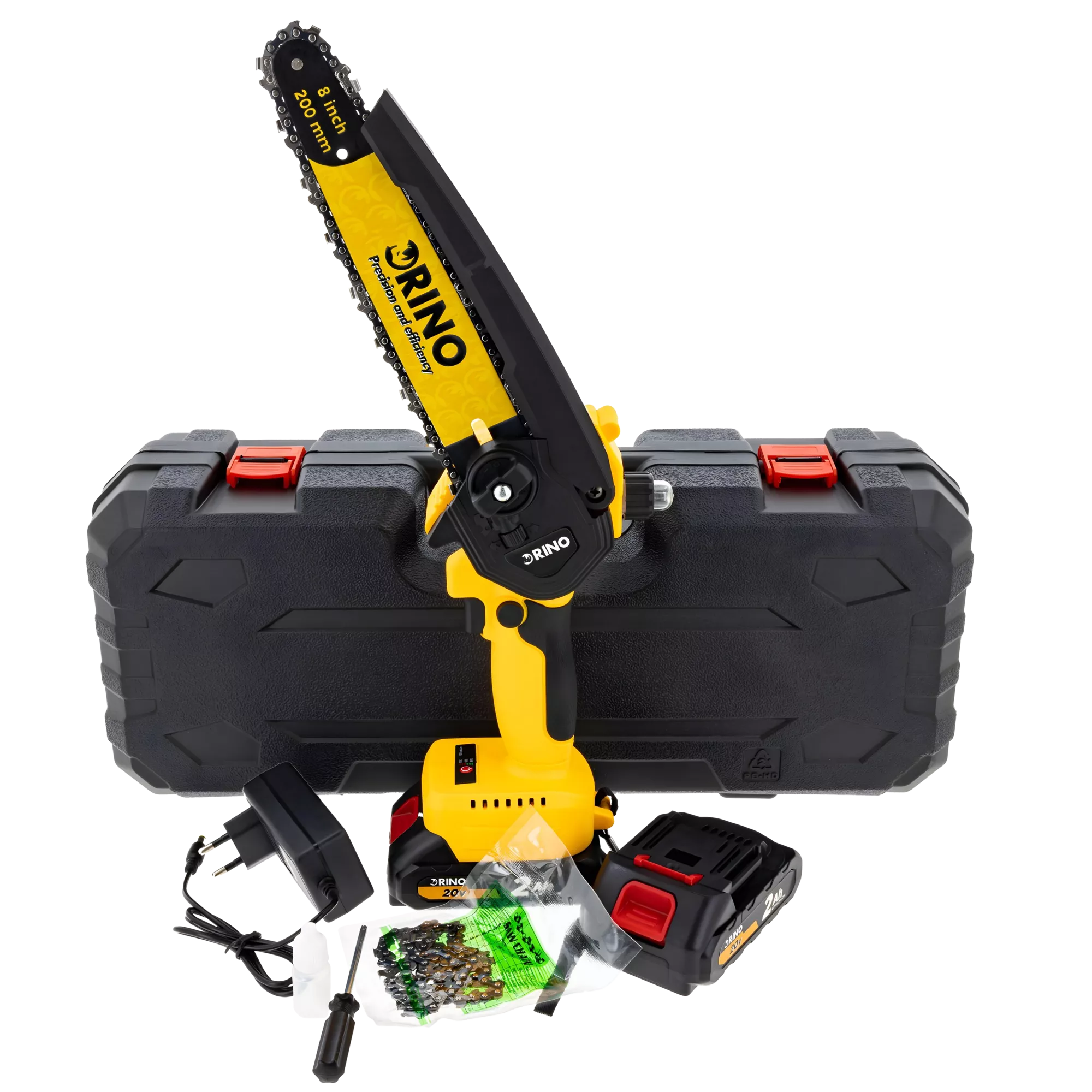 Pilarka łańcuchowa akumulatorowa Rino MSAW20LI-20 20V 200 mm z ładowarką i 2 akumulatorami – kompaktowa moc do ogrodu i warsztatu