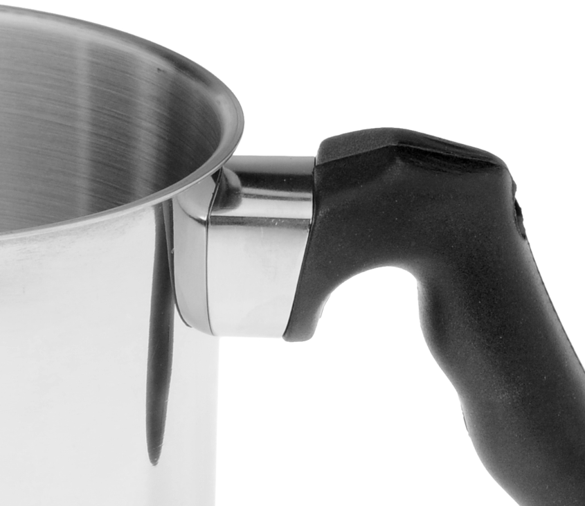 Garnek stalowy z uchwytem z tworzywa sztucznego do gotowania mleka. Pojemność całkowita 1,5l.