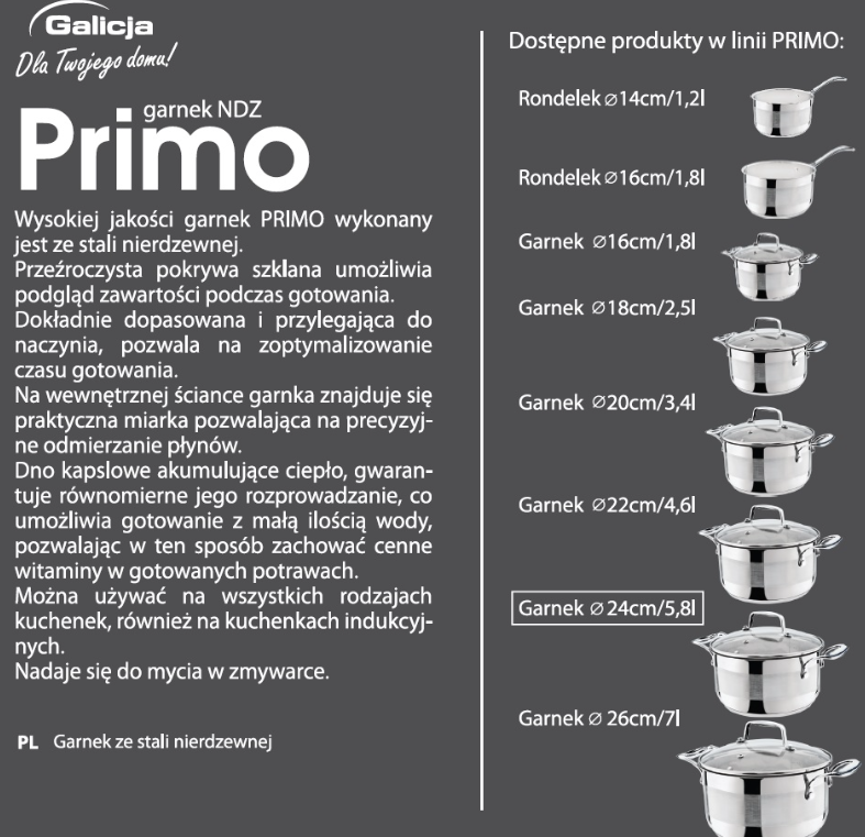 Wysokiej jakości garnek Primo wykonany jest ze stali nierdzewnej. Przezroczysta pokrywa szklana umożliwia podgląd zawartości podczas gotowania. Dokładnie dopasowana i przylegająca do naczynia, pozwala na zoptymalizowanie czasu gotowania. Na wewnętrznej ściance garnka znajduje się praktyczna miarka. Dno kapslowe akumulujące ciepło, gwarantuje równomierne jego rozprowadzanie, co umożliwia gotowanie z małą ilością wody, pozwalając w ten sposób zachować cenne witaminy w gotowanych potrawach.