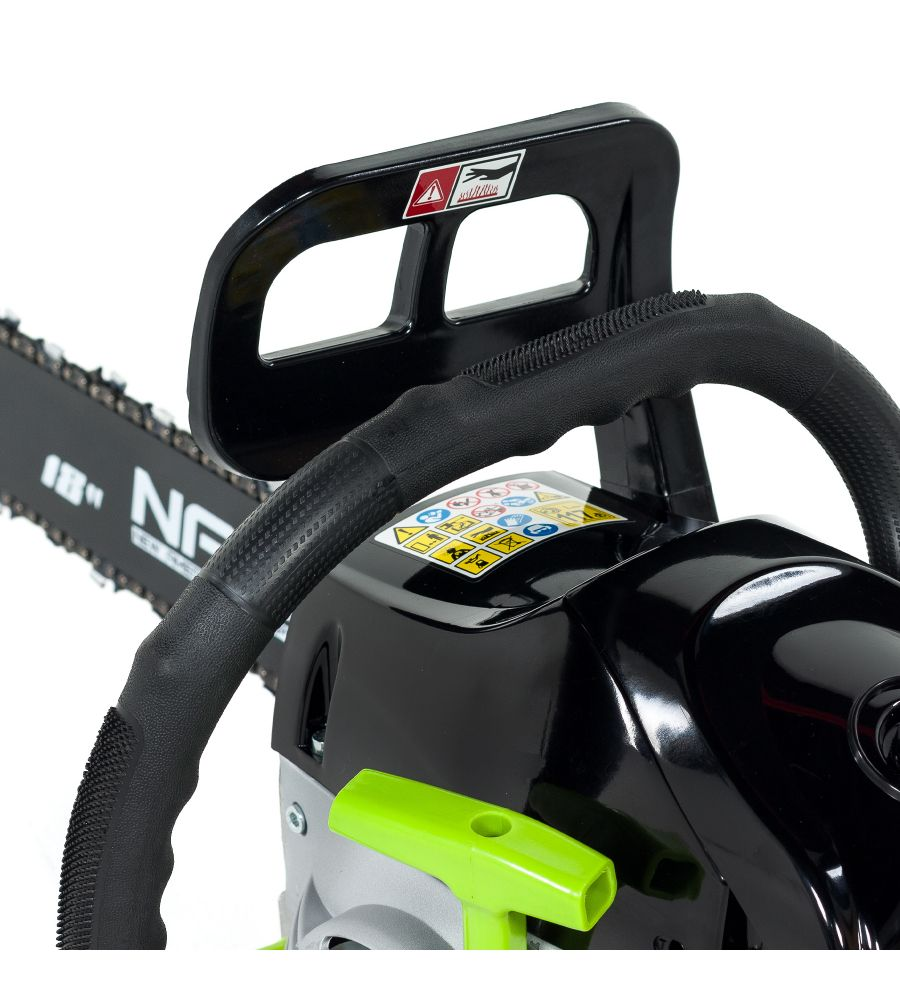 Piła posiada stalowy grzebień oporowy, mechanizm natychmiastowego zatrzymania łańcucha oraz wbudowane amortyzatory (antywibracyjną rączkę) minimalizujące drgania podczas pracy.