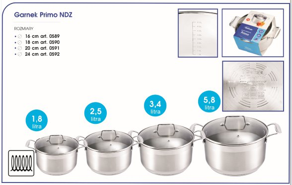 Wysokiej jakości garnek Primo wykonany jest ze stali nierdzewnej. Przezroczysta pokrywa szklana umożliwia podgląd zawartości podczas gotowania. Dokładnie dopasowana i przylegająca do naczynia, pozwala na zoptymalizowanie czasu gotowania. Na wewnętrznej ściance garnka znajduje się praktyczna miarka.