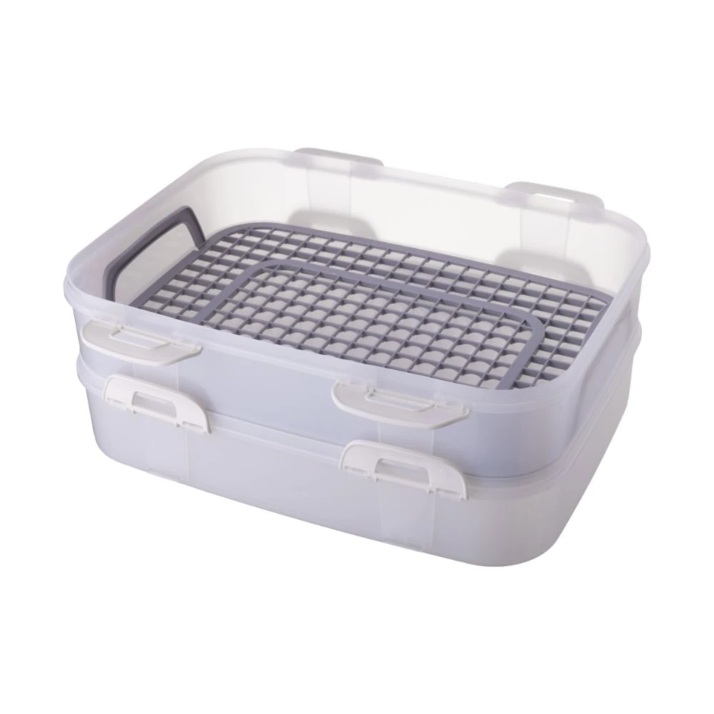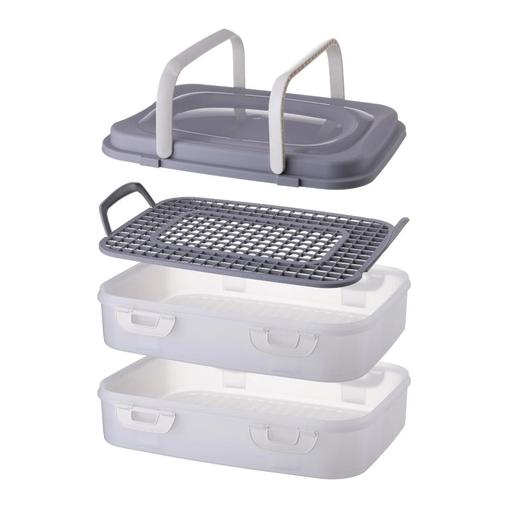 Wyposażony w klipsy zabezpieczające oraz składane uchwyty, zapewnia wygodne i bezpieczne przenoszenie. Dodatkowym atutem jest wyjmowana wkładka z uchwytami, która ułatwia dostęp do zawartości. W razie potrzeby możesz korzystać tylko z jednego poziomu, co zwiększa funkcjonalność pojemnika.