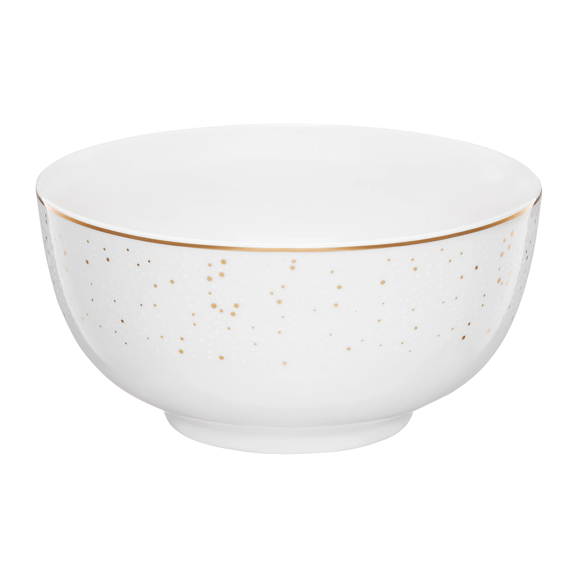 Porcelanowa salaterka Aurelia marki Ambition to doskonałe połączenie klasycznej formy i eleganckiego zdobienia. Wykonana z wysokiej jakości porcelany, zachwyca subtelnym wzorem złotych kropek oraz dekoracyjnym rantem w kolorze złota, który dodaje jej wyjątkowego, luksusowego charakteru.