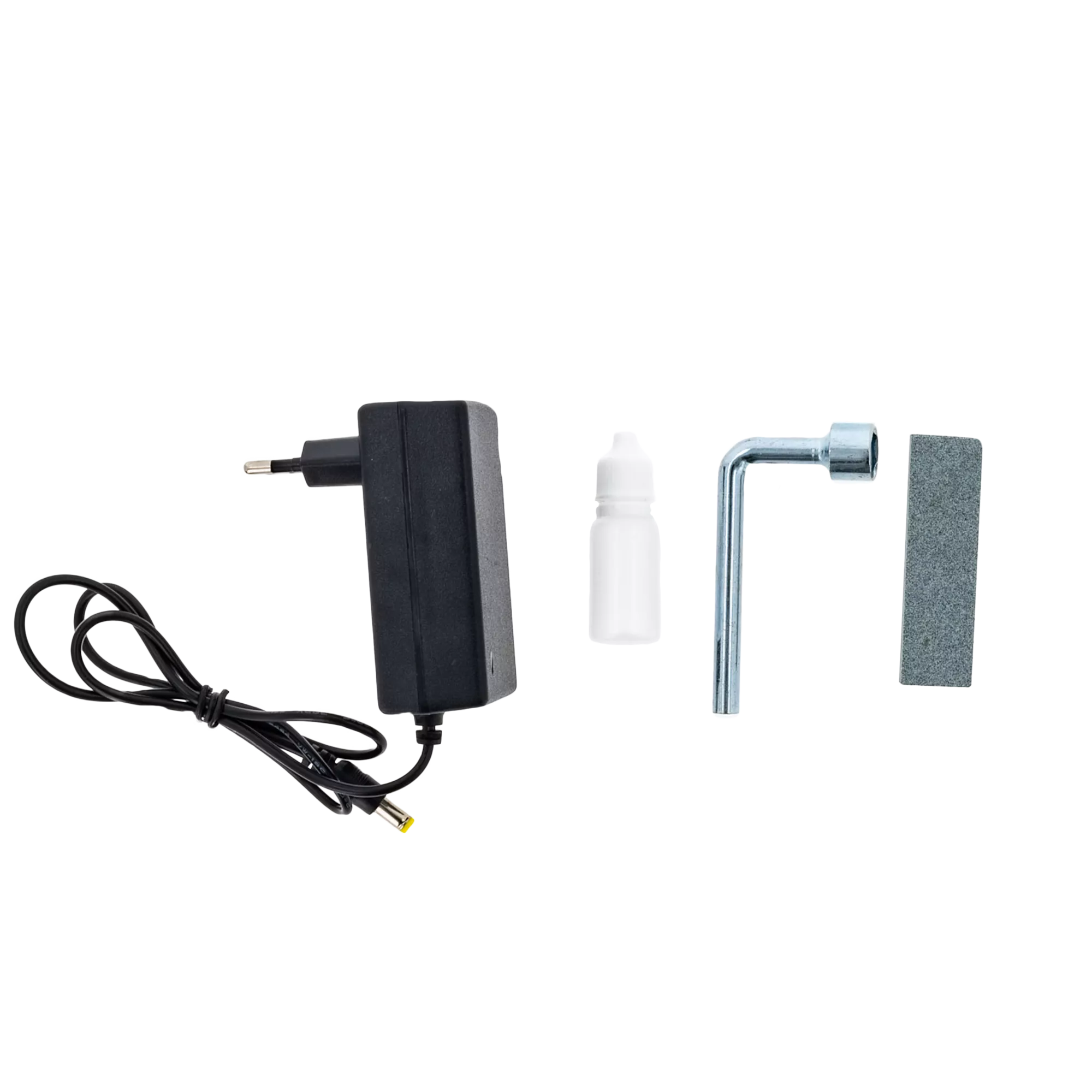 Bogaty zestaw akcesoriów – w zestawie twarda walizka, dwa akumulatory 2 Ah, ładowarka, butelka oleju, klucze, kamień szlifierski.