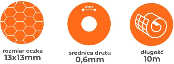 Siatka o oczkach o wymiarach 13x13 mm i średnicy drutu 0,6 mm zapewnia skuteczną ochronę przed intruzami oraz zabezpiecza zwierzęta przed ucieczką lub atakami drapieżników.