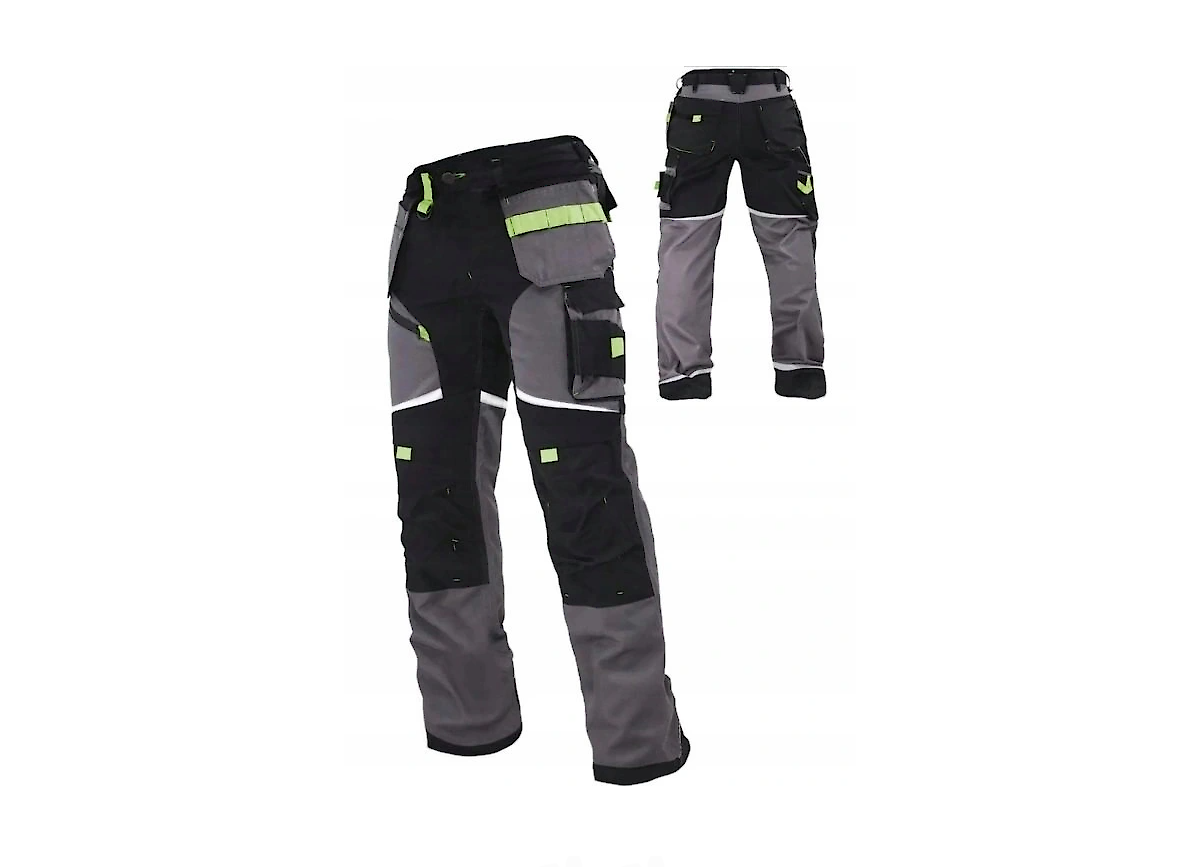 Spodnie wyposażono w liczne, funkcjonalne kieszenie – w tym odpinane kieszenie monterskie na zamek YKK, kieszenie kolanowe na wkładki ochronne oraz miejsca na narzędzia, telefon, miarę czy identyfikator. Dodatkowe elementy odblaskowe zwiększają bezpieczeństwo pracy.