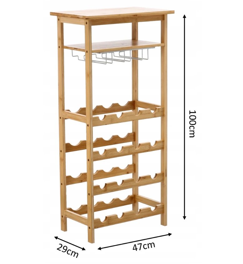Bambusowy stojak na wino o wymiarach 47x29x100 cm to eleganckie i funkcjonalne rozwiązanie do przechowywania i wyeksponowania kolekcji win. Zapewnia zarówno praktyczność, jak i estetykę, doskonale pasując do różnych aranżacji wnętrz. Konstrukcja stojaka jest stabilna, co umożliwia bezpieczne przechowywanie butelek wina. Dodatkowo, stojak posiada wygodne uchwyty na kieliszki oraz półkę, co czyni go jeszcze bardziej praktycznym. Wykonany z wysokiej jakości bambusa, stojak jest ekologiczny i trwały, co sprawia, że jest to także świadomy wybór dla osób dbających o środowisko.