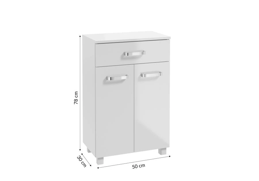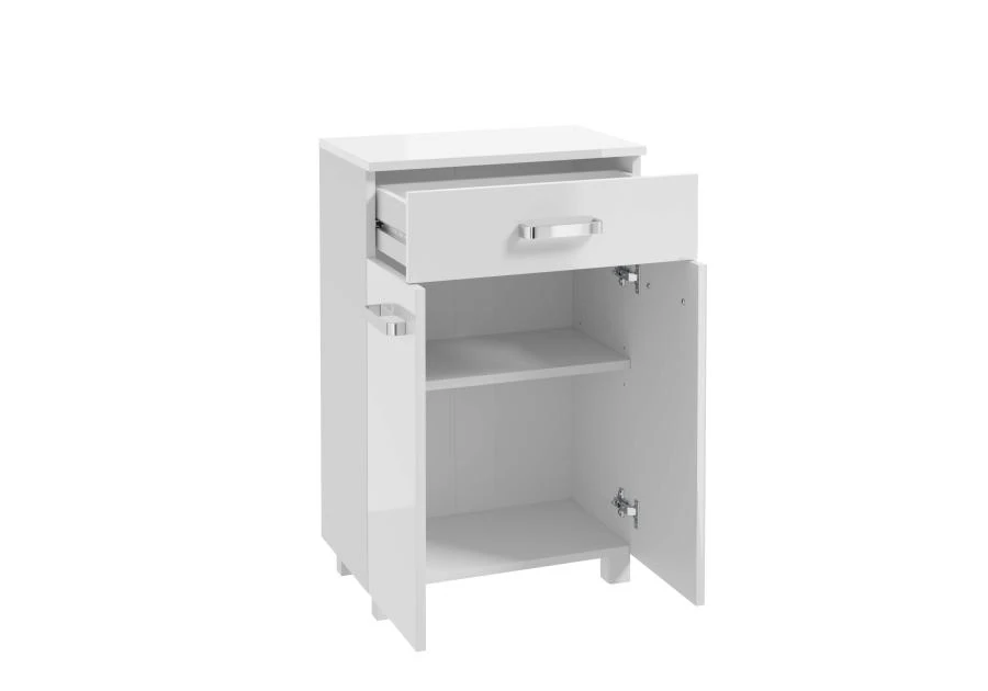 Szafka stojąca Mila 50 cm biały połysk to elegancki i praktyczny mebel z dwojgiem drzwi i szufladą, idealny do przechowywania i uporządkowania wnętrza.