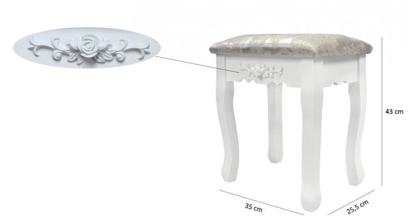 W komplecie z toaletką otrzymasz również wygodny taboret z tapicerowanym siedziskiem w kwiatowy wzór, który nie tylko zwiększa komfort korzystania, ale także dodaje elegancji Twojej przestrzeni.