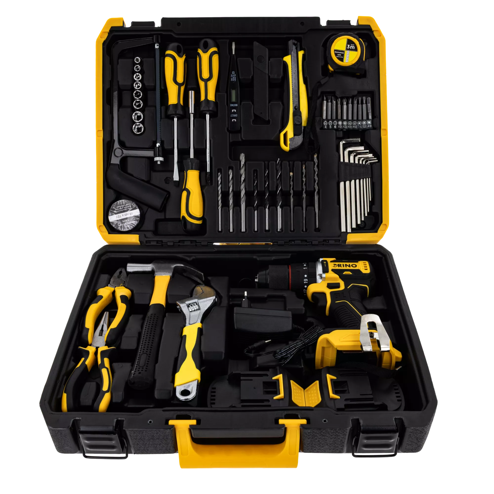 Wiertarko-wkrętarka DRI20LI Rino sprzedawana jest w zestawie, który zapewnia gotowość do pracy od razu po rozpakowaniu. W komplecie znajdziesz m.in.: