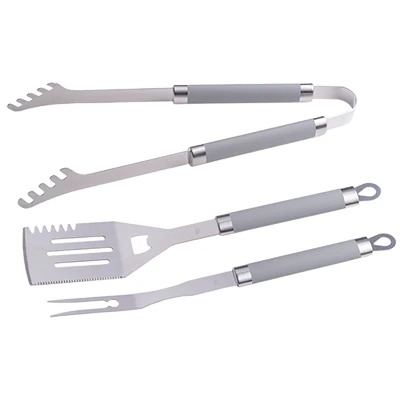 Zestaw akcesoriów do grilla 3 sztuki to niezbędne narzędzia do grillowania – szczypce, łopatka i widelec. Wykonane z wysokiej jakości stali nierdzewnej, z gumowymi rączkami, zapewniają wygodę i bezpieczeństwo. Idealne do precyzyjnego obracania potraw na grillu i ich serwowania.