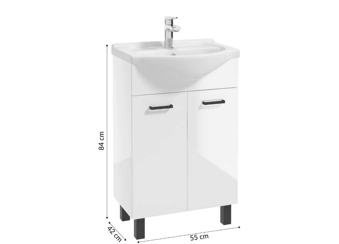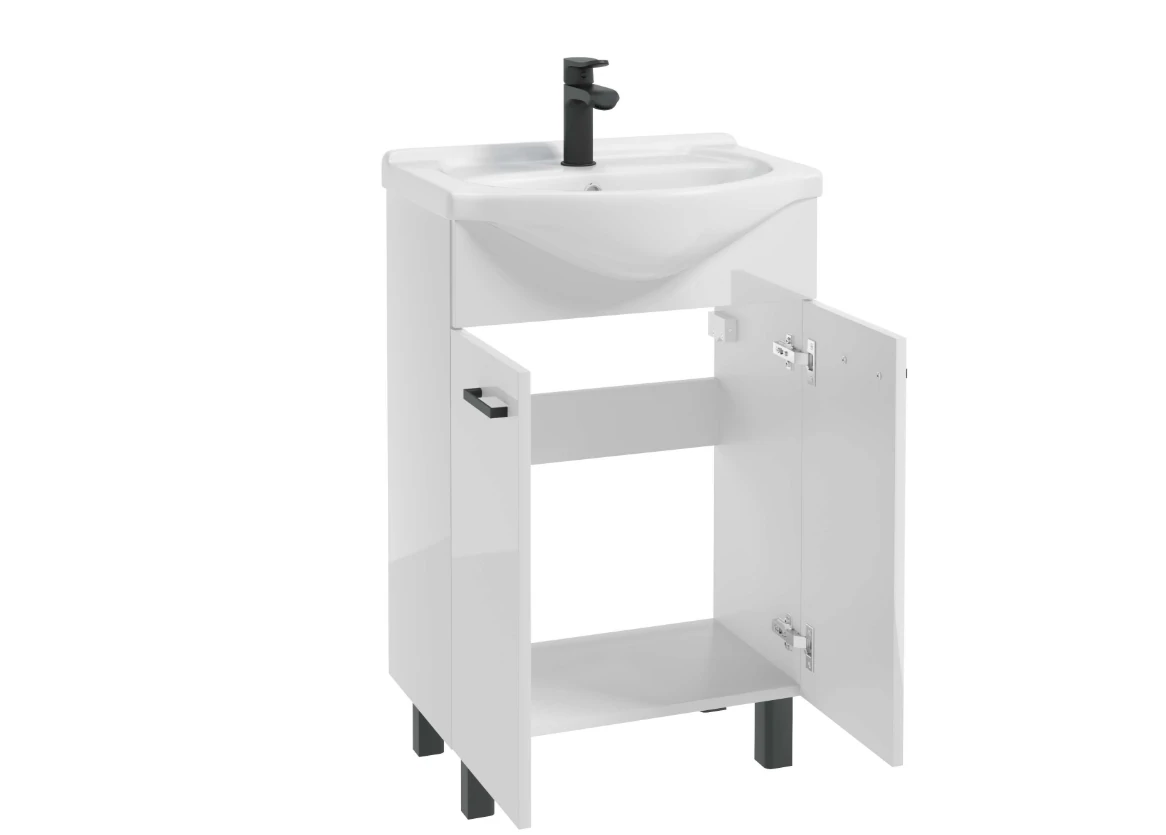 Zestaw Łazienkowy Szafka z Umywalką Mea 55 cm - Biały Połysk z Czarnymi Uchwytami