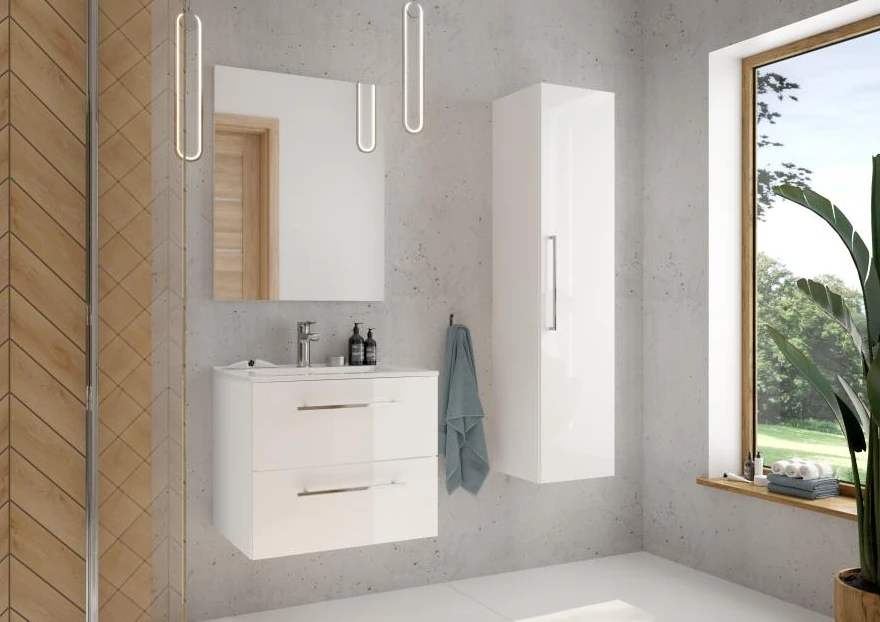 Dzięki szerokości 60 cm zestaw Pinia świetnie sprawdzi się w mniejszych łazienkach, zapewniając funkcjonalność i estetykę. Możesz go zamontować w dowolnym miejscu, dopasowując układ mebli do swoich potrzeb.